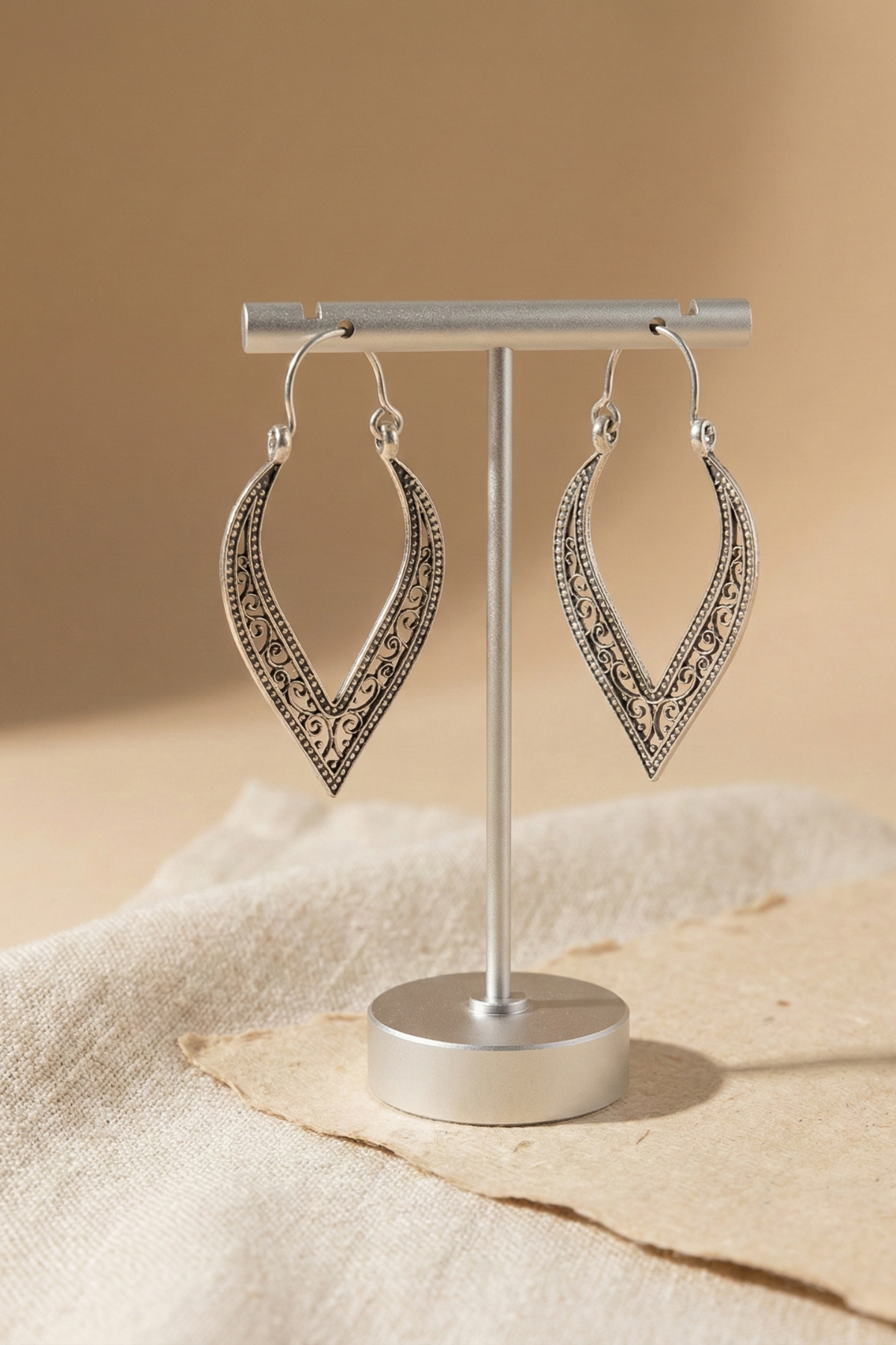 Gümüş renkli yüzeydeki incimsi noktalar ve etnik oyma motiflerle öne çıkan bu bohem küpe, merkezindeki güneş formuyla mistik bir hava taşır. Hafif yapısı sayesinde gün boyu rahat kullanılır ve hem günlük stile hem de özel kombinlere karakteristik bir dokunuş ekler.